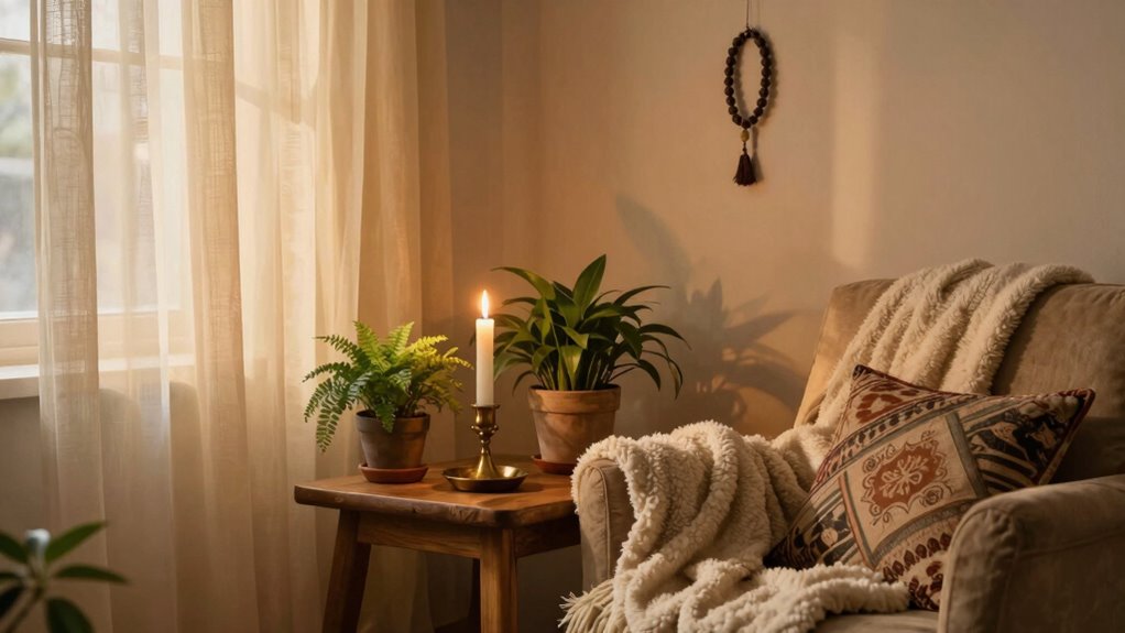 You don’t need religious symbols in your prayer area if they don’t resonate with your spirituality. Instead, focus on spiritual symbolism that holds personal meaning, like meaningful quotes or natural elements. Add decorative accents that inspire calm, such as candles or crystals. This approach creates a space that feels authentic and peaceful, reflecting your spirituality without cluttering it with symbols that don’t truly connect with you.