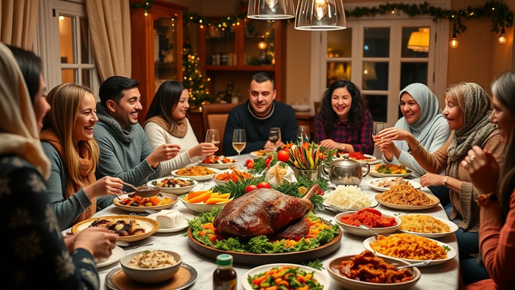 To host a stress-free, inclusive halal holiday gathering, plan a menu with fresh, flavorful ingredients like vegetables, halal meats, and satisfying vegetarian options. Clearly label dishes and use separate utensils to prevent cross-contamination, making your guests feel comfortable and respected. Mix classic dishes with halal twists and add vibrant plant-based options for variety. Thoughtful presentation and communication set the tone for a warm, welcoming atmosphere—keep exploring to discover more tips for a seamless celebration.