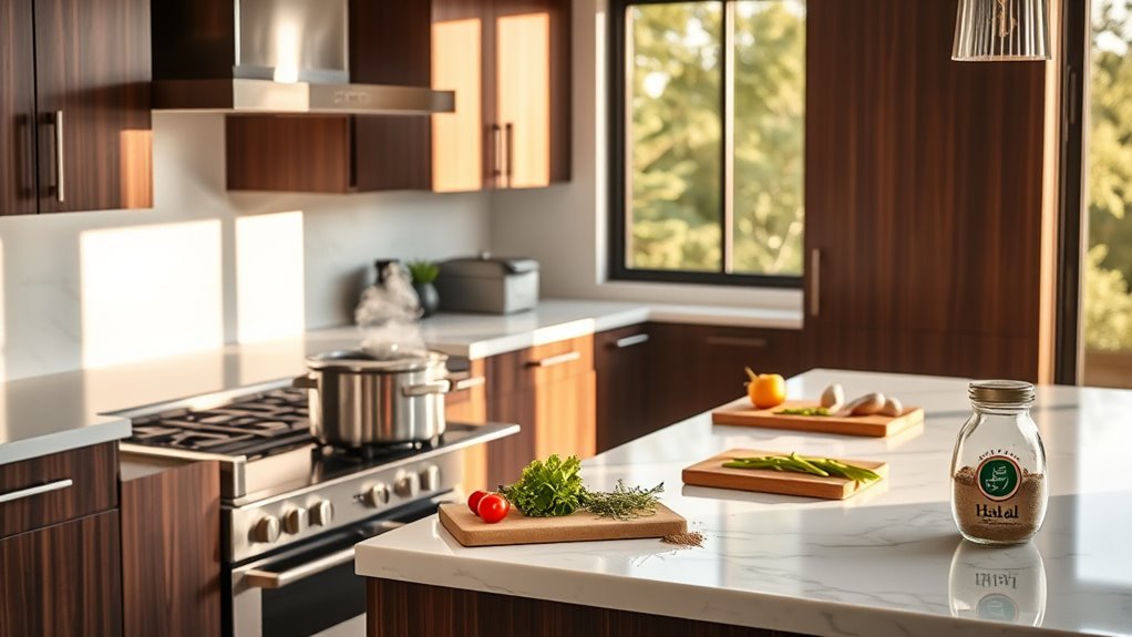Have you ever wondered how to create a kitchen that respects halal dietary guidelines? If you’re starting from scratch, it’s an exciting opportunity to design a space that aligns with your faith and dietary needs. First, you need to plan your pantry carefully. Invest in separate storage containers and shelves for halal-certified foods and non-halal items. This helps prevent cross-contamination and keeps your kitchen organized. When shopping, look for reputable halal certifications on products, especially for meats, sauces, and packaged goods. Always read labels diligently to guarantee they contain no alcohol, pork derivatives, or other forbidden ingredients.