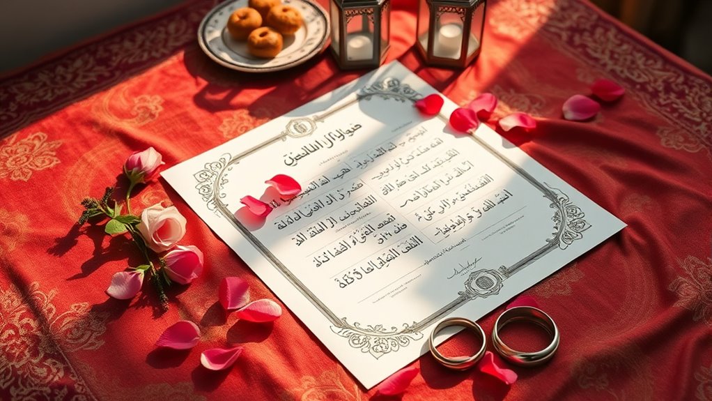 Islamic marriage contracts, known as “nikah,” play an essential role in defining the rights and responsibilities of both partners in a marriage. When you enter this sacred union, the nikah outlines fundamental elements that govern your relationship. It’s not just a ceremony; it’s a legal and spiritual framework that guarantees both parties understand their roles and obligations. One of the foundational aspects of the nikah is the involvement of a wali, or guardian, who represents the bride in the marriage. This responsibility isn’t merely ceremonial; it highlights the importance of having an advocate for the woman’s interests, guaranteeing her voice is heard and respected.