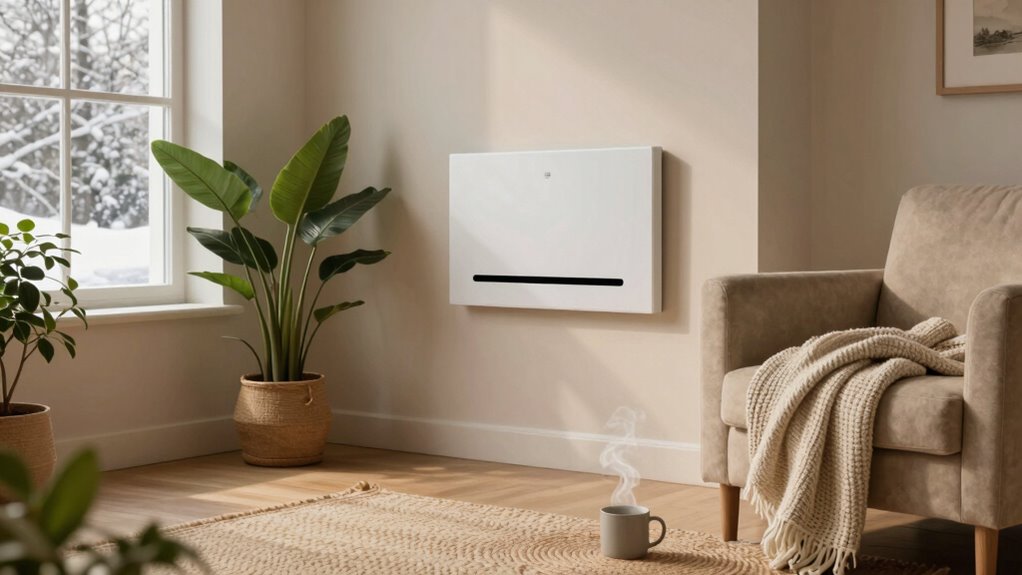 Yes, certain furniture and decor can help amplify warmth silently. Furniture insulation, like plush sofas or upholstered chairs, traps heat and prevents cold drafts, making your space warmer. Decorative textiles such as thick curtains, area rugs, and cozy throws also add an extra layer of insulation, reducing heat loss. These elements work together to create a warmer environment without noise or dry air, enhancing comfort naturally and quietly.