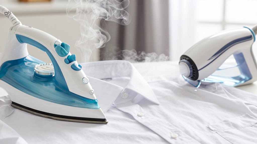 Steam irons and garment steamers can damage delicate fabrics if you’re not careful. Steam irons, with higher heat and direct contact, pose a greater risk for fabric damage if used improperly. Garment steamers are generally safer for delicate materials because they use lower, more controlled steam. For material safety, always check fabric labels and test on a small area first. Proper technique helps prevent damage, ensuring your garments stay in perfect condition.