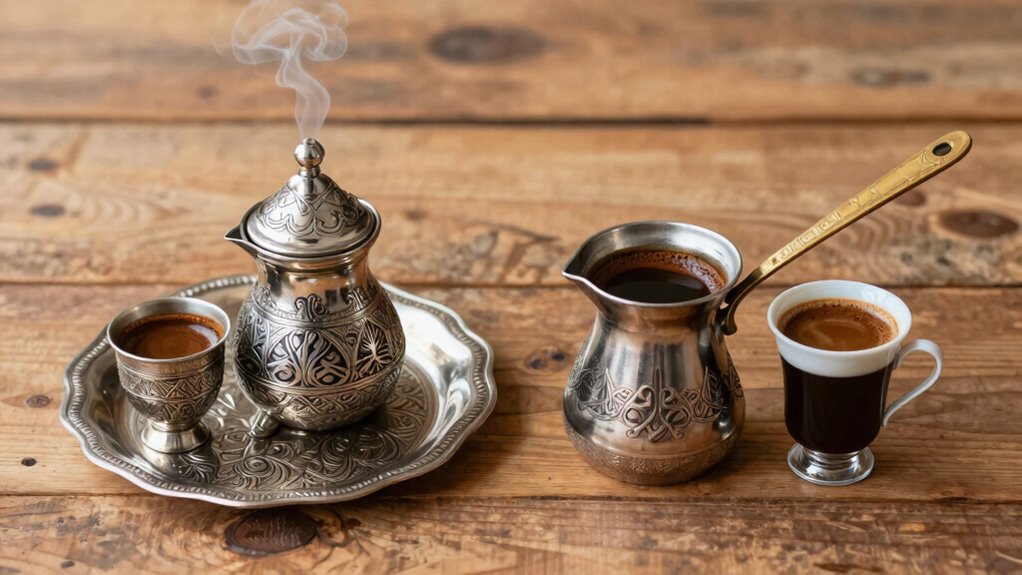 Imagine uncovering the secret to authentic flavor—your coffee brewing methods and serving vessel styles. For Arabic coffee, you’ll need a traditional dallah, a sleek, long-handled pot, perfect for slow brewing. Turkish coffee demands a cezve, a small, long-handled pot that creates thick, rich coffee. These vessels aren’t just tools—they’re essential to the ritual, capturing the essence of each tradition and elevating your coffee experience.