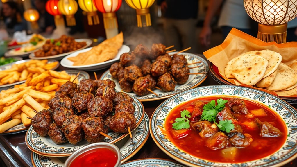 Hui Muslim food traditions in China showcase a unique halal cuisine that’s rich in flavor and cultural significance. You’ll find vibrant culinary festivals where lamb skewers and aromatic spices come to life. The community celebrates authenticity, with food prepared according to strict halal guidelines passed down through generations. This combination of immersive experiences and warm flavors reflects the Hui’s deep ties to their heritage. Discover more about the fascinating fusion of tradition and culinary artistry within this cuisine.