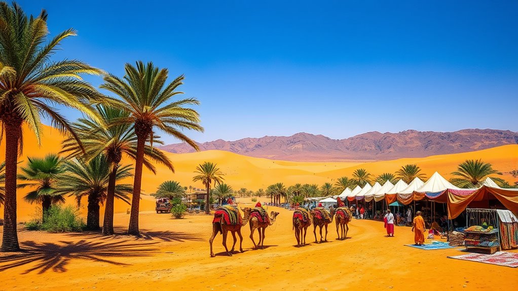Desert oases are lifelines along halal trade routes, helping ancient civilizations thrive. They provided essential water and shade, enabling caravans to transport spices, textiles, and metals across harsh terrains. These bustling hubs facilitated not just commerce but also the exchange of culture and ideas, shaping economies and promoting innovation. Traders adhered to ethical practices, fostering community and trust. There’s much more to explore about the lasting impact of these trade networks on modern economies.