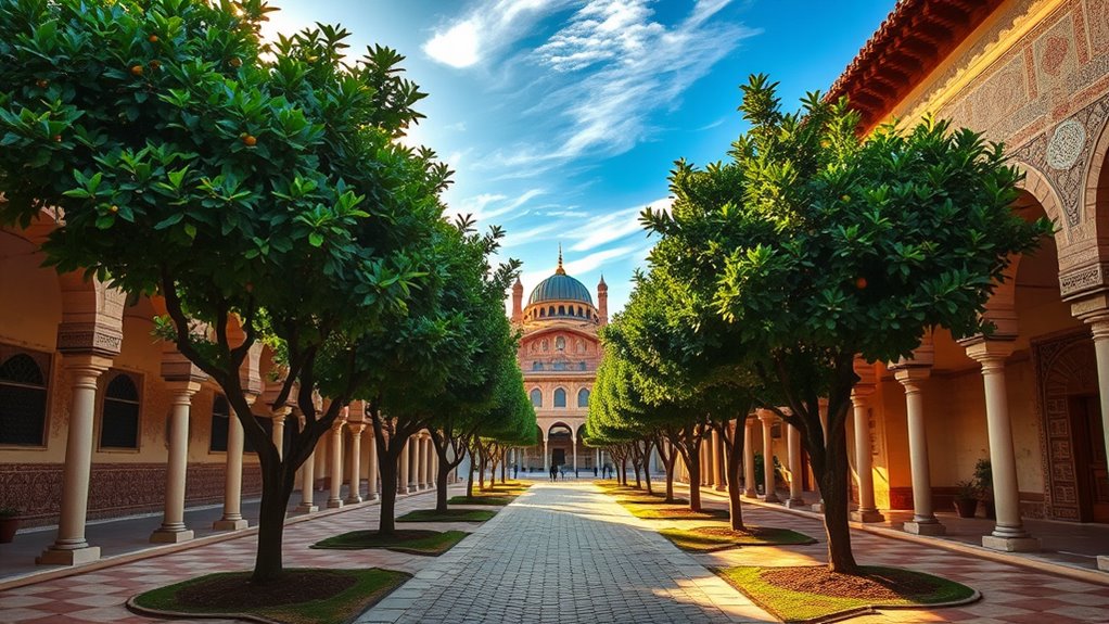 Then there’s the Alhambra in Granada, a stunning fortress and palace that encapsulates the essence of Islamic architecture. As you meander through its lush gardens and elegant courtyards, you’ll encounter delicate stucco work and elaborate tile mosaics, each a tribute to the artistic prowess of its creators. The intricate arabesques and geometric patterns invite you to ponder their meaning, revealing the deep philosophical concepts embedded in Islamic art. You’ll find yourself captivated by the flowing water features that enhance the tranquility of the surroundings, creating a serene atmosphere that feels almost otherworldly.