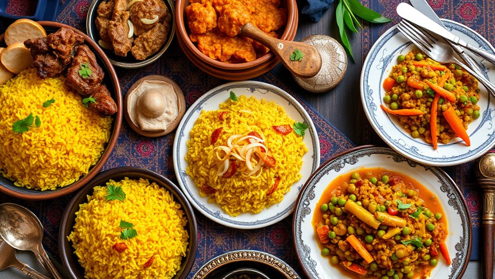 Culinary traditions showcase how food shapes identity and community, and biryani exemplifies this beautifully. You’ll find Indian, Pakistani, and Middle Eastern variations, each with distinct flavors and cooking techniques. For instance, Hyderabadi biryani layers marinated meat with saffron rice, while Karachi biryani cooks rice separately. The choice of regional ingredients and methods brings unique stories to life. Each dish not only pleases the palate but also connects you to a rich cultural heritage. There’s much more to uncover!