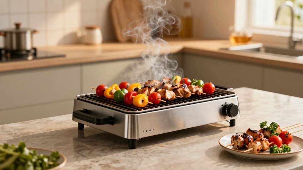 Have you ever wondered how indoor grilling manages to be smoke-free while still delivering delicious kebabs? The key lies in advanced ventilation systems and smoke absorbers. Modern indoor grills are equipped with powerful ventilation that quickly pulls smoke away from the cooking area, preventing it from filling your space. Smoke absorbers further trap and neutralize airborne particles, ensuring cleaner air and less lingering smell. These systems are designed to efficiently manage smoke, making indoor grilling practical even in small apartments. By effectively removing smoke and odors at the source, they create a safer, more comfortable environment. This combination allows you to enjoy perfectly cooked kebabs without worrying about smoke filling your home or triggering smoke alarms. Additionally, the use of high contrast ratios in cooking techniques can enhance the visual appeal of your kebabs, making them even more appetizing. Incorporating sustainable materials in your grilling setup can also contribute to a more eco-friendly kitchen experience. Understanding nail biology can also help you appreciate the importance of preventing smoke damage to your cooking tools and surfaces. Moreover, the principles of mind-body healing can enhance your cooking experience, allowing you to enjoy the process and the flavors even more. Furthermore, embracing digital content exploration can provide innovative ideas and techniques to elevate your indoor grilling adventures.