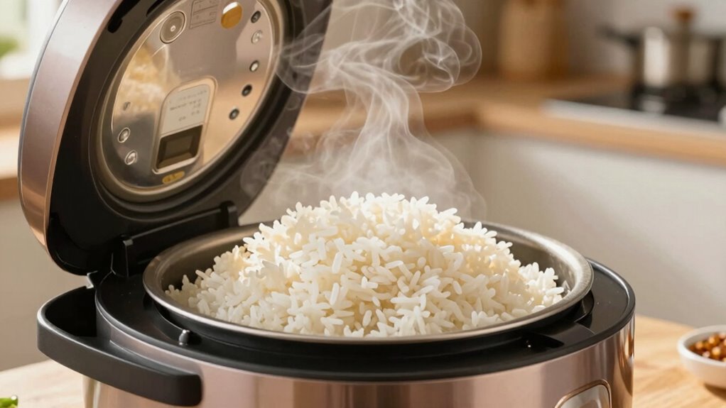 To get perfect rice every time, you should adjust water ratios based on your rice type and desired texture. Selecting the right cooking mode on your rice cooker can make a big difference in results. Additionally, understanding the importance of toddler social skills can enhance your family meals by promoting positive interactions during mealtime. Experimenting with these settings helps you achieve consistently ideal rice, and knowing how to optimize your device settings can streamline your cooking process. For instance, applying safety checks to your rice cooking routine ensures that your appliance functions correctly and safely. Furthermore, being aware of cookie categories can help you manage your online resources effectively while cooking.