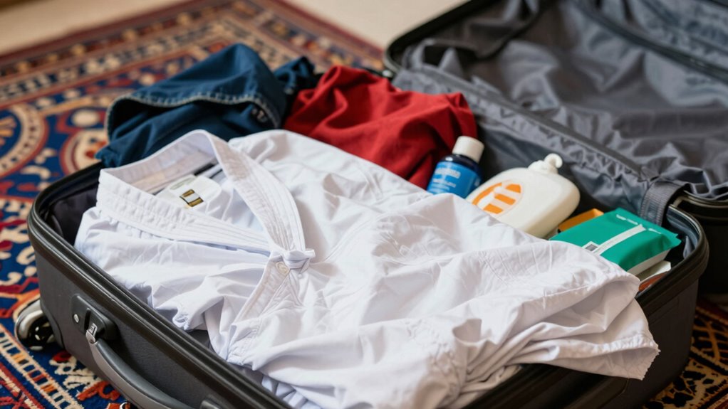 When packing for Umrah, you should prioritize traditional attire and modest clothing. Pack loose, comfortable garments that cover your shoulders and knees, respecting Islamic modesty standards. Include lightweight, breathable fabrics suitable for the climate. Don’t forget a simple, clean white ihram for men and modest abayas or dresses for women. Avoid overly flashy or tight clothing, ensuring your attire aligns with religious guidelines while keeping you comfortable during your pilgrimage.