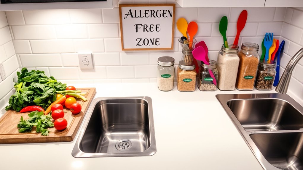 Yes, using specialized utensils can considerably help prevent cross-contact. You should invest in allergen-safe tools like dedicated cutting boards, knives, and measuring cups for allergenic foods. Color-coding these utensils can also make it easier to remember which tools are safe for specific ingredients. Always wash these tools thoroughly after use, and consider having separate storage for them to avoid accidental mix-ups. This practice guarantees a safer cooking environment for everyone.