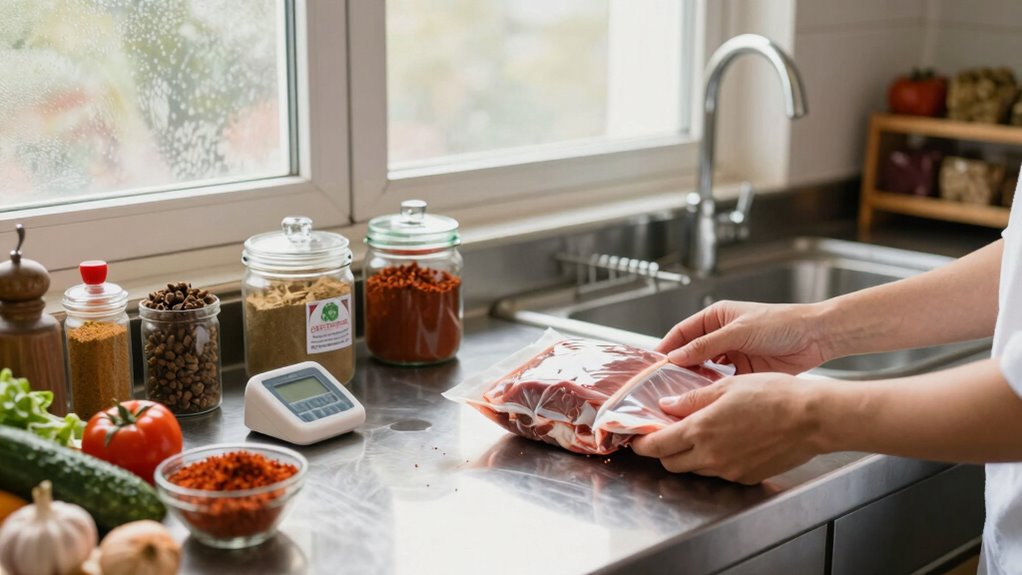 Properly handling and preparing halal meat and poultry is essential to guarantee your food remains compliant with halal standards. Start with meat sourcing, making certain all meat comes from suppliers with valid halal certification. This confirms the meat has been slaughtered according to Islamic guidelines. Always keep halal meat separate from non-halal products to prevent cross-contamination. Use dedicated cutting boards, knives, and storage containers for halal meat, and wash all utensils thoroughly after handling. When preparing, handle the meat with clean hands and avoid touching other ingredients unnecessarily. Proper hygiene and strict adherence to halal sourcing protocols help maintain the integrity of your meat and ascertain it meets halal standards from sourcing through preparation.