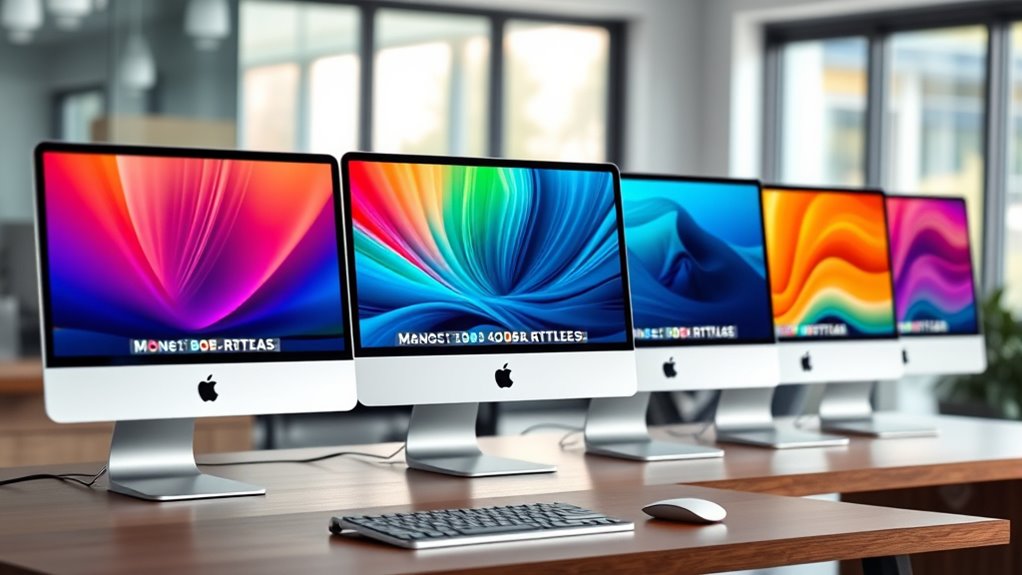 If you’re exploring the best 24-inch iMac configurations of 2025, I recommend considering options with the latest M4 chip, ample memory like 16GB or more, and high-quality displays with Nano-Texture Glass for creative work. For multimedia tasks, prioritize models supporting up to two external monitors, while those focusing on portability might prefer lightweight, vibrant color options. Keep in mind your storage needs—whether 256GB or 512GB SSD—and explore the top setups to match your unique needs as we go further.
