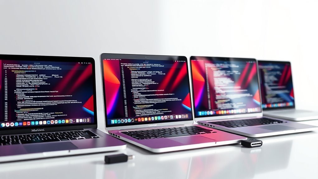 When selecting a 2TB MacBook Pro, compatibility with your existing Apple devices can substantially enhance your overall experience. Seamless integration allows features like iPhone Mirroring, message sharing, and FaceTime calls to work effortlessly. Using Apple ecosystem services such as iCloud, AirDrop, and Continuity makes data synchronization and workflow smoother across devices. It’s important to verify that the macOS version supports your preferred apps and tools for peak performance. Supporting features like AirPlay and universal control can boost cross-device functionality and multitasking. Choosing a model with ecosystem-compatible hardware, including Thunderbolt ports and the latest Bluetooth versions, ensures smooth connectivity with peripherals and accessories. Prioritizing ecosystem compatibility helps create a cohesive, efficient setup tailored to power users’ needs.