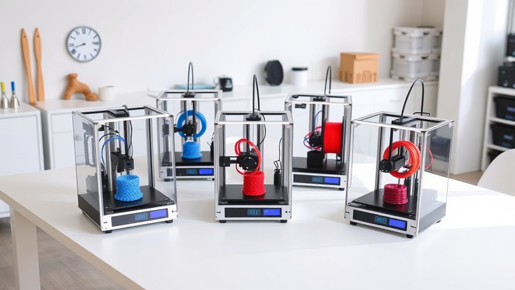 When choosing a 3D printer under $500, ease of assembly plays a crucial role in how quickly you can start printing. Many budget models arrive pre-assembled or semi-assembled, which saves time and reduces frustration. Fully assembled printers let you begin printing immediately, while kits require several hours for assembly and calibration. Automatic bed leveling systems are a great feature, simplifying setup and ensuring your first layer sticks perfectly. User-friendly interfaces, like touchscreens or simple software, make operation straightforward, especially for beginners. Clear instructions and online tutorials are essential for assembling DIY models efficiently and avoiding common mistakes. Overall, choosing a printer with simple assembly enhances your experience, letting you focus on creating rather than troubleshooting.