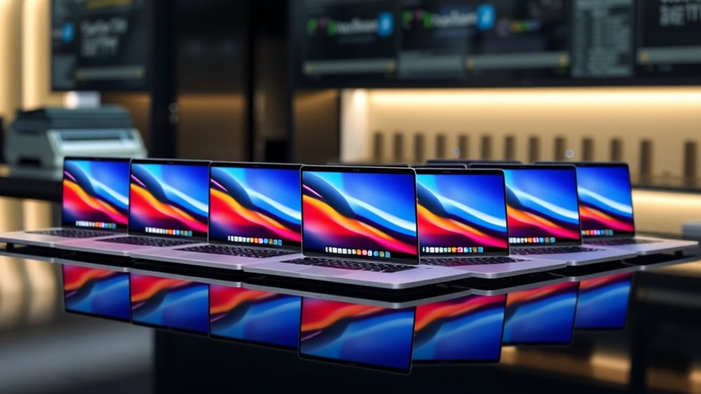 Choosing a 4TB MacBook Pro that fits seamlessly into your existing Apple ecosystem can considerably boost your productivity and user experience. When your laptop syncs effortlessly with your iPhone, iPad, and other Apple devices, features like Handoff, AirDrop, and Universal Control become second nature. Compatibility with iCloud guarantees your files, photos, and app data are accessible across all devices without hassle. Supporting Apple-specific features like FaceTime, Messages, and AirPlay enhances seamless communication and entertainment. Additionally, verifying support for accessories such as AirPods, external displays, and peripherals guarantees a smooth integration experience. Making sure your MacBook Pro supports the latest macOS updates is vital for maintaining all these features over time, making ecosystem compatibility a key factor in your choice.