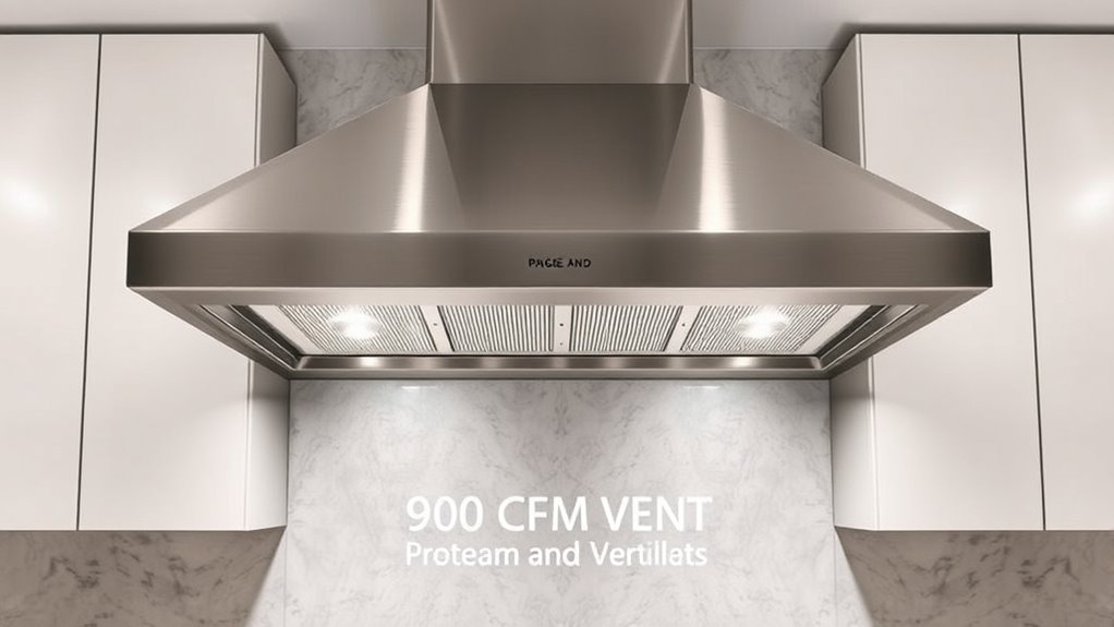 Choosing a 900 CFM ducted range hood means prioritizing strong ventilation to keep your kitchen air clean. Its high airflow capacity effectively removes smoke, grease, and odors, ensuring a healthier cooking environment. To maximize ventilation effectiveness, proper duct sizing is essential; a 6-inch rigid steel duct helps maintain ideal airflow and minimizes noise during operation. The design of the vent system also matters—features like dual intake motors or advanced airflow paths boost efficiency. Regular maintenance of filters and ductwork prevents airflow restrictions that could diminish performance. Finally, correct installation height and duct configuration are vital. When these factors are carefully considered, your range hood will perform at its best, providing powerful, consistent ventilation that keeps your kitchen fresh and smoke-free.