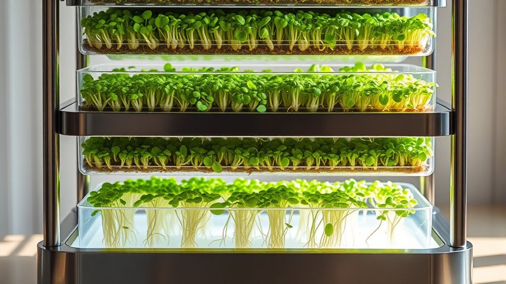 Automated watering features play an essential role in maintaining consistent moisture levels, which are necessary for healthy seed germination and sprout development. These systems use timers and sensors to deliver precise amounts of water, reducing guesswork. Many sprouters rotate sprinklers 360 degrees, ensuring uniform coverage and preventing dry spots or overwatering. The ability to adjust watering frequency and duration lets me customize irrigation based on seed type, season, or room conditions. This automation minimizes manual effort, keeping humidity and moisture levels stable without frequent rinsing. Properly designed watering systems also prevent water stagnation, reducing mold risk by promoting efficient circulation and drainage. Overall, these features make sprouting more reliable, healthier, and less labor-intensive.