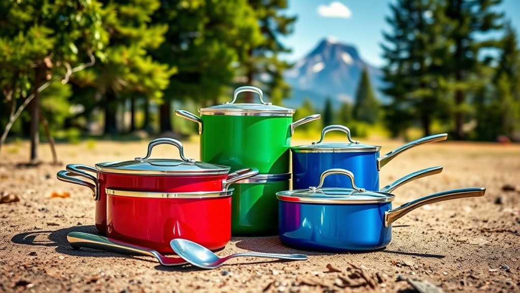 While I appreciate the importance of weight and portability in camping cookware, material durability is equally essential. I’ve found that high-grade anodized aluminum and stainless steel are my go-to materials. Durable anodized aluminum offers a lightweight yet tough surface, which resists warping despite repeated outdoor exposure. On the other hand, stainless steel nesting sets with thick bases evenly distribute heat and can withstand impacts, making them perfect for rugged conditions. I also prioritize non-toxic, food-grade materials to avoid any risk of chemical leaching during high-heat cooking. Choosing durable materials not only enhances resistance to dents and scratches but also extends the lifespan of my cookware, so I can focus on enjoying my camping adventures.
