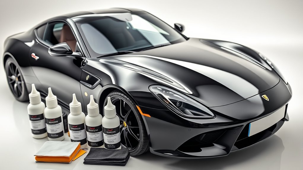 Think of curing time like letting a fine wine breathe; it’s essential for the perfect finish. I recommend waiting at least 24 hours after applying the ceramic coating before exposing your car to water or harsh conditions. During this period, the coating hardens and bonds, giving your vehicle that glossy, durable shield. Patience here guarantees your investment pays off with a long-lasting, stunning shine.