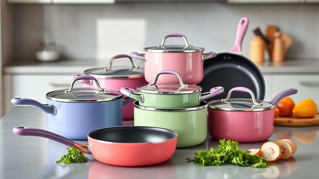 High-quality ceramic nonstick cookware delivers effortless food release, making cooking and cleanup simpler and healthier. With a superior nonstick surface, I find food slides right off, often needing only a rinse or wipe to clean. This ease of use encourages healthier cooking since less oil is required. Consistent heat distribution across the ceramic surface ensures even cooking, preventing hotspots that can burn or undercook food. When choosing a set, I look for reinforced ceramic layers that resist scratches and extend the lifespan of the nonstick coating. Proper care keeps PFAS-free coatings intact, reducing peeling or flaking over time. Overall, excellent nonstick performance enhances my cooking experience, making it more efficient, safer, and enjoyable.