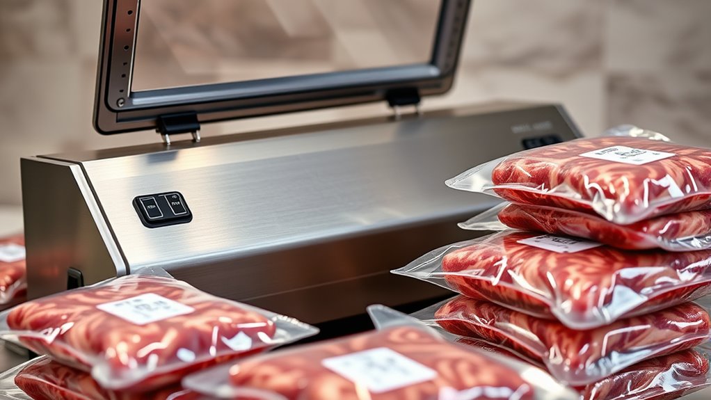 Durability and material quality are vital factors that determine how well a chamber vacuum sealer performs over time, especially with frequent use in sealing large quantities of halal foods. High-quality sealers are made with durable stainless steel, which withstands constant operation and resists corrosion. The material quality of seals and gaskets directly affects their ability to maintain airtight seals over the long term, preventing leaks. Heavy-duty components like industrial-grade pumps and sturdy chamber walls enhance both longevity and reliability. Reinforced features such as thick seal strips and resilient lid constructions prevent wear and tear from repeated cycles. A robust build guarantees consistent performance, even when sealing liquids, oily foods, or bulk quantities, making durability a vital consideration for reliable, long-lasting sealing.