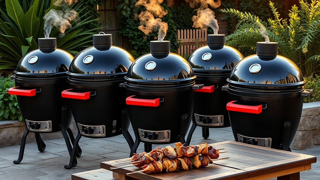 If you’re looking for the best charcoal kamado grills for perfect kebabs in 2025, I’ve found some top picks that deliver excellent heat retention, precise temperature control, and versatile cooking options. From the large Char-Griller AKORN to portable models like Outvita’s ceramic grill, each offers durability and great smoke flavor. With accessories like rotisserie skewers and pizza stones, these grills help elevate your barbecue game. Want detailed insights? Keep going to find the perfect match.