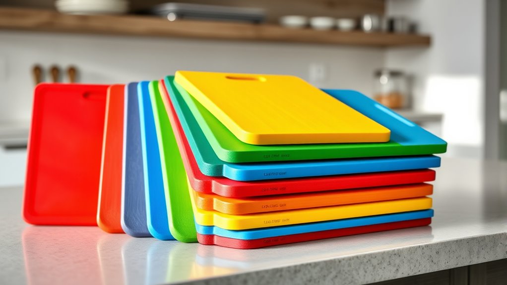 Durability and longevity are crucial factors when selecting color-coded cutting boards because they directly impact safety and cost-effectiveness. High-quality plastic or bamboo boards resist warping, cracking, and staining, ensuring they hold up with frequent use. Thicker mats, around 1mm or more, are less prone to cuts and wear, extending their lifespan. Proper maintenance, like dishwasher cleaning at recommended temperatures and avoiding excessive heat, helps preserve their integrity. Choosing materials like BPA-free, non-porous plastics or bamboo reduces bacteria buildup and material degradation, further enhancing durability. Regularly inspecting boards for deep cuts or warping and replacing damaged ones is essential to maintain hygiene. Investing in durable boards means they’ll last longer, saving money and keeping your kitchen safer over time.