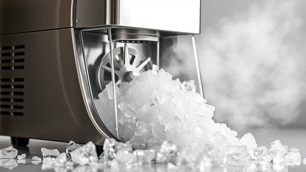 Maintaining a commercial ice crusher requires consistent attention to cleaning and lubrication to keep it running smoothly. Regularly cleaning blades and internal parts prevents ice buildup, mold, and bacteria growth, ensuring hygiene and peak performance. Depending on usage, you’ll need to rinse parts with water and use food-safe disinfectants weekly or daily. Lubricating moving parts like motors and hinges maintains smooth operation and extends the machine’s lifespan. It’s also essential to inspect blades regularly for wear or damage, replacing them when necessary to maintain ice quality and prevent motor strain. After cleaning, draining and drying the machine prevents rust and corrosion, especially in humid environments. Proper maintenance minimizes breakdowns and reduces long-term repair costs, making it a critical factor when selecting a commercial ice crusher.