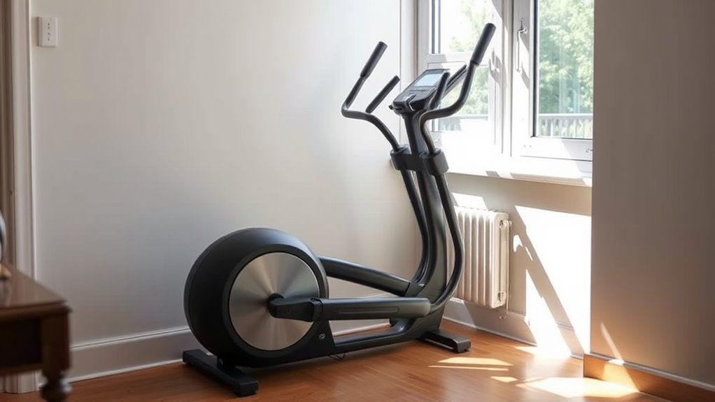 Choosing a space-saving elliptical machine means paying close attention to its design features that maximize efficiency without compromising stability. Many models have a foldable design, making storage simple when you’re not working out. Compact ellipticals typically measure less than 40 inches in length, ensuring they fit comfortably in tight spaces. Built-in transport wheels are common, allowing you to move the machine easily from room to room. The vertical and horizontal dimensions are carefully optimized to give you enough workout area while keeping the footprint minimal. Foldable ellipticals often incorporate center fold bars and slim profiles that enhance space efficiency. These thoughtful design elements ensure you get a stable, effective workout without sacrificing precious space, making them ideal for small apartments or home gyms.