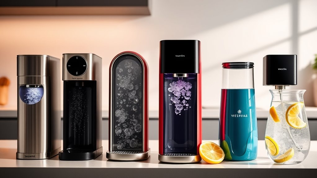 If you want to upgrade your hydration routine, I recommend exploring the 13 best countertop sparkling water makers like SodaStream ART, Philips, or Carbon8. These sleek, user-friendly devices offer quick carbonation, stylish designs, and eco-friendly features that make sparkling water at home effortless. Whether you prefer manual or electric models, there’s a perfect fit for your lifestyle and kitchen. Keep going to discover which one suits your needs best.