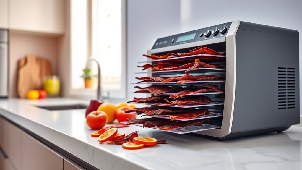 Choosing a dehydrator with precise temperature control is vital for making safe and high-quality halal jerky. Accurate temperature settings ensure you maintain the ideal drying temperature around 165°F, which is essential for safety and flavor. Digital thermostats with 1°F increments allow for fine adjustments, preventing over- or under-drying that can ruin texture and taste. Consistent temperature accuracy across the entire unit guarantees even dehydration, reducing the risk of raw or undercooked spots. Additionally, adjustable temperature ranges, like 95°F to 176°F, offer flexibility for different stages of dehydration and various food types, all while adhering to halal standards. Reliable sensors and calibration features further ensure your dehydrator maintains the desired temperature, giving you confidence in producing safe, delicious jerky every time.