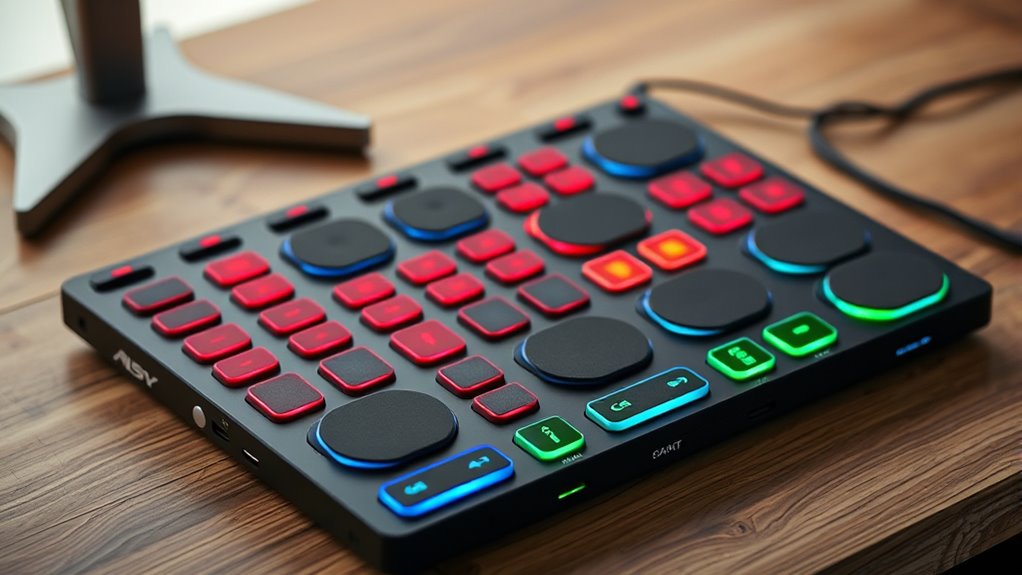 When choosing a portable digital drum pad, durability and build quality can make all the difference in guaranteeing your investment lasts through frequent use and transport. High-quality materials like silicone, rubber, or tough plastics are essential to withstand repeated strikes and prolonged play. The frame’s construction and connection points also matter, as they prevent cracking, warping, or breakage over time. Reinforced edges and shock-absorbing features protect the internal electronics during intense sessions or accidental impacts. Additionally, water-resistant or waterproof designs help prevent damage from spills or moisture, extending the pad’s lifespan. Secure wiring and sturdy connections are vital too, as they prevent internal damage from constant movement. In short, a well-built drum pad ensures durability, reliability, and long-term performance on the go.