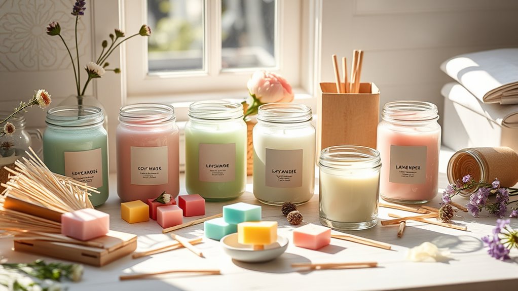 If you’re looking for the best DIY candle making kits with soy wax, I’ve found some fantastic options that are perfect for beginners and experienced crafters alike. These kits come with everything from soy wax, scents, dyes, to tools like melting pots and wicks, making it easy to personalize your candles. Whether you want a simple kit or one with advanced features, there are plenty to choose from. Keep exploring to discover which kit suits your creativity best.