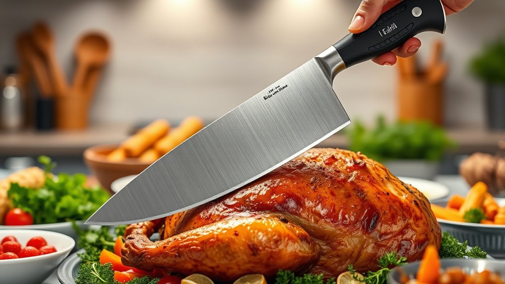 Safety and security features are crucial considerations to guarantee a worry-free experience when using an electric carving knife for Eid roasts. I look for models with a safety lock to prevent accidental activation during storage or transport, reducing risks. A blade release button is essential for quick, secure removal of blades, making cleaning and replacement safer. Blade guards or covers protect my fingers from cuts when the knife isn’t in use, adding an extra layer of safety. An ergonomic handle with a non-slip grip helps me maintain control, especially when slicing through tough meats. Finally, an automatic shut-off or safety shut-down feature prevents overheating and electrical hazards during extended use, giving me peace of mind while preparing my feast. These features ensure safe, efficient carving every time.