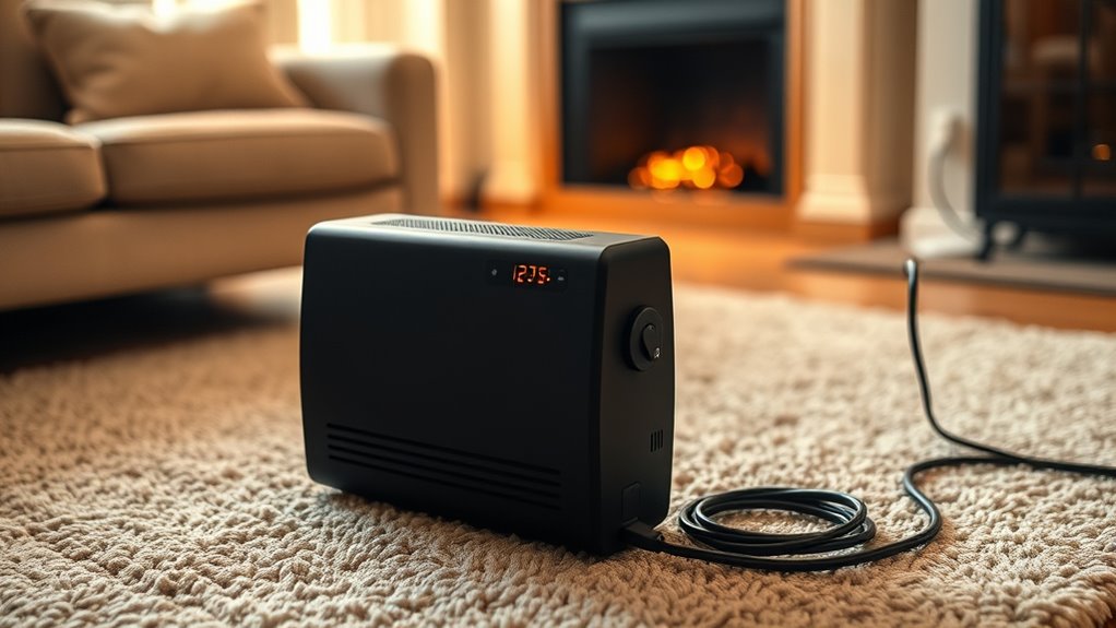Safety shutoff features prevent overheating risks by automatically turning off the heater when it reaches a certain temperature or detects abnormal heat levels. I rely on these features to keep my space safe, as they interrupt power before any damage occurs. It’s like having a built-in safeguard that kicks in when things get too hot, giving me peace of mind and protecting my home from potential fire hazards.