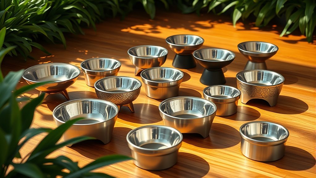 Selecting the right bowl capacity and size for elevated stainless steel dog bowls is essential for ensuring your pet’s comfort and satisfaction during meals. I always recommend choosing a bowl size that matches your dog’s age, breed, and typical portion to avoid spills and promote proper feeding. For medium to large dogs, look for bowls with a capacity ranging from 1 to 2 quarts (4 to 8 cups) to meet their daily food and water needs. It’s also vital that the bowls are at least 2 inches deep to prevent splashing. Avoid small bowls for larger breeds, as they’ll require frequent refills, creating mess and inconvenience. Ultimately, consider your pet’s consumption habits to promote health and hygiene.