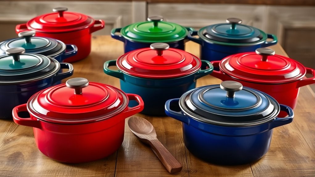 If you’re looking for the top enameled cast iron Dutch ovens in the 7-quart size for 2025, I recommend checking out options like Overmont, Crock-Pot Artisan, P&P CHEF, TeamFar, CUKOR, Leonyo, and Tramontina. These models combine durability, stylish designs, and excellent moisture retention, making them perfect for various cooking tasks. Continue exploring to find detailed insights that help you choose the perfect oven for your kitchen needs.