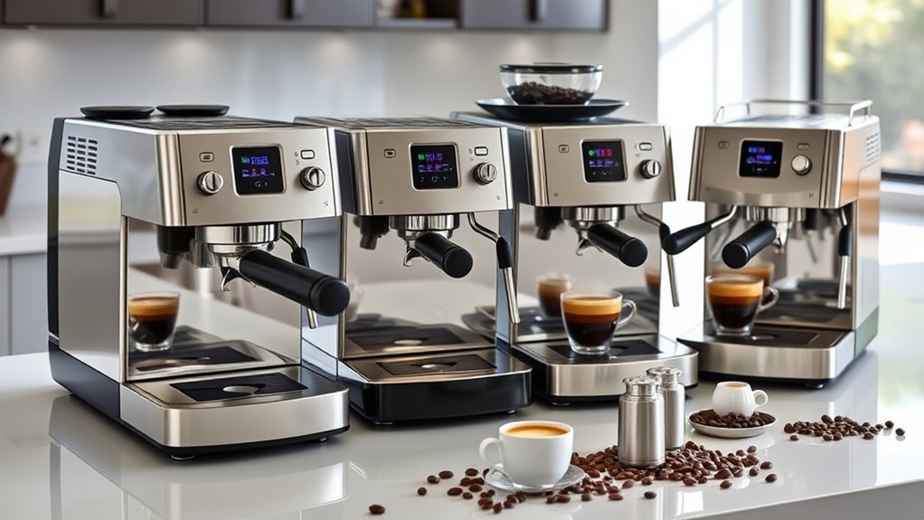 If you’re looking for the 15 best espresso machines under $500 that can deliver barista-quality coffee, I’ve got you covered. These models feature strong 15 to 20-bar pumps, durable build materials, and easy-to-use controls that make brewing like a pro simple. They include options with milk frothers, compact sizes, and quick heat-up times. Keep in mind, some require regular cleaning and maintenance for perfect results. Stick with me, and you’ll learn how to pick the best one for your home needs.