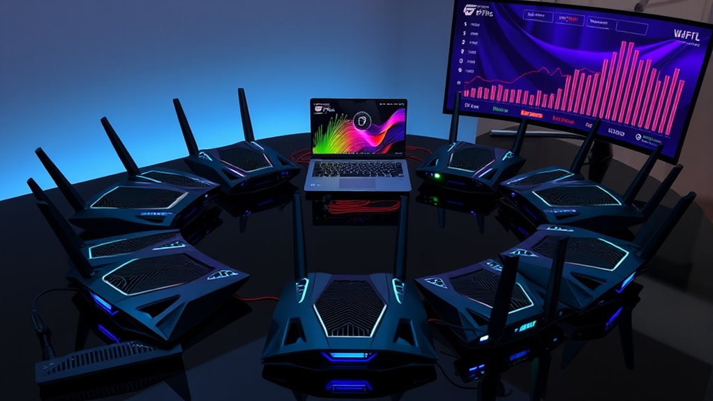I’ve tested the 14 fastest WiFi 7 routers of 2025, and they offer incredible speeds from 3.6 Gbps up to 15 Gbps, supporting advanced features like Multi-Link Operation, OFDMA, MU-MIMO, and multi-gig ports. These models cover large areas, support dozens of devices, and include robust security features. If you want to discover which routers excel in speed, coverage, and future-proofing, stick around—there’s a lot more to explore.