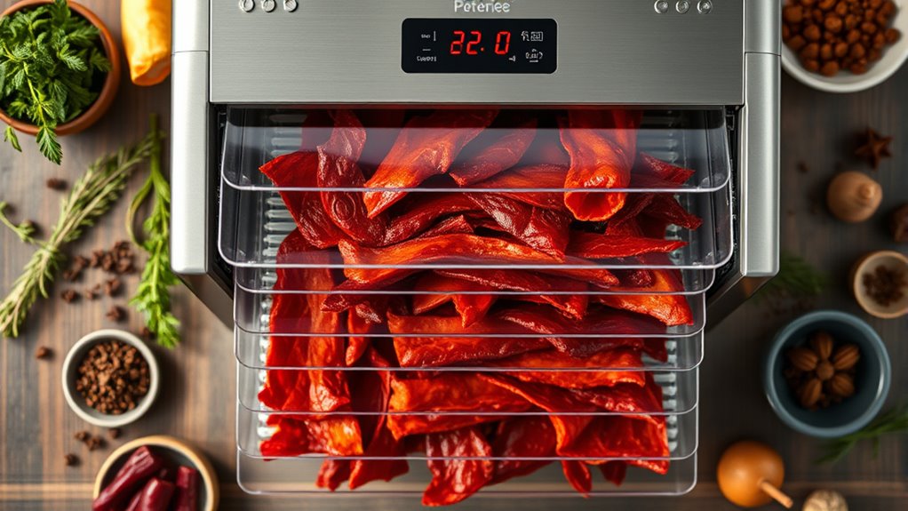 Yes, there are specific trays best suited for jerky. I recommend trays with even spacing and a mesh surface, which allow airflow and prevent sticking. These trays help dehydrate the meat uniformly, giving you consistent, high-quality jerky. Look for trays that are easy to clean and durable, so you can reuse them often. The right trays make all the difference in achieving perfect, evenly dried jerky every time.