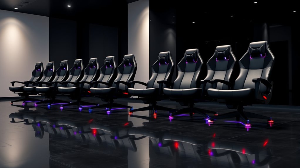 Choosing a gaming chair with a footrest isn’t just about style; it’s about guaranteeing comfort and proper support during those extended gaming marathons. Ergonomic features like adjustable lumbar and neck support help maintain good posture and reduce strain. Cushions made of high-density or memory foam offer lasting comfort by supporting key pressure points without losing shape. Adjustable armrests, reclining backrests, and customizable headrests let you tailor the chair to your ergonomic needs, preventing fatigue. Footrest mechanisms that smoothly extend or adjust ensure your legs are well-supported, reducing discomfort. Properly designed ergonomic features not only improve comfort but also help alleviate pressure points, promote healthy circulation, and prevent musculoskeletal issues, making your gaming sessions more enjoyable and less taxing on your body.