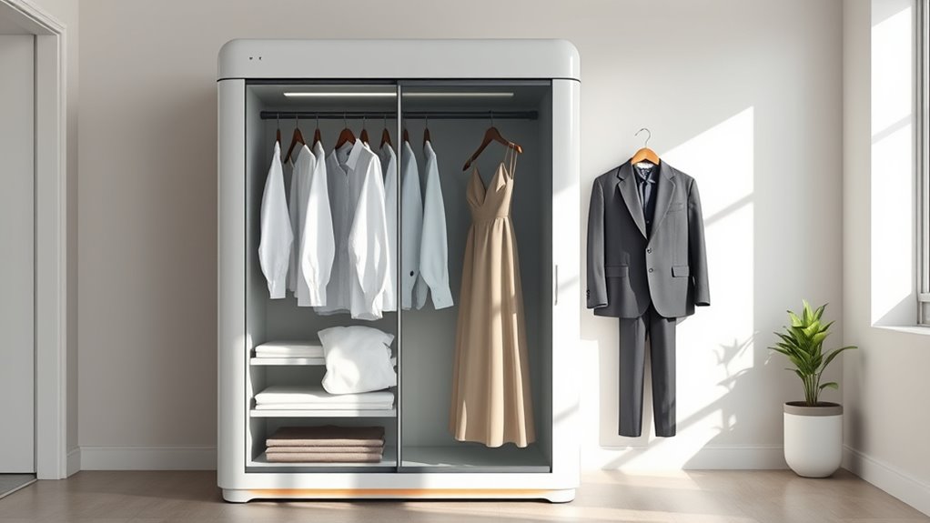 Garment-care steam closet sanitizers eliminate bacteria and odors by releasing high-temperature steam that penetrates fabrics deeply. I’ve found that the heat destroys germs and mold spores, while the moisture neutralizes bad smells. This process not only kills bacteria effectively but also refreshes my clothes without using harsh chemicals. It’s a quick, eco-friendly way to keep my wardrobe smelling fresh and hygienic, making my clothes feel like new every time.