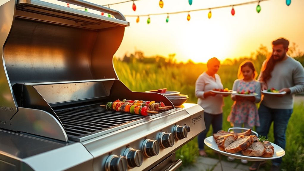 Burner power, measured in BTUs, directly impacts how quickly and effectively your grill heats up, which is essential for efficient halal BBQ parties. Higher BTUs mean more intense heat and faster cooking times, making it easier to handle large gatherings. Precise temperature control is vital, so look for grills with adjustable knobs that regulate gas flow, ensuring consistent results. Multiple burners allow for independent heat zones, letting you cook different foods at varying temperatures simultaneously. This flexibility is perfect for diverse dishes. Additionally, flame tamers or heat diffusers help distribute heat evenly across the surface, preventing hot spots that could compromise your food. Finally, a reliable ignition system ensures your burners light quickly and stay lit, giving you full control over your grilling process.