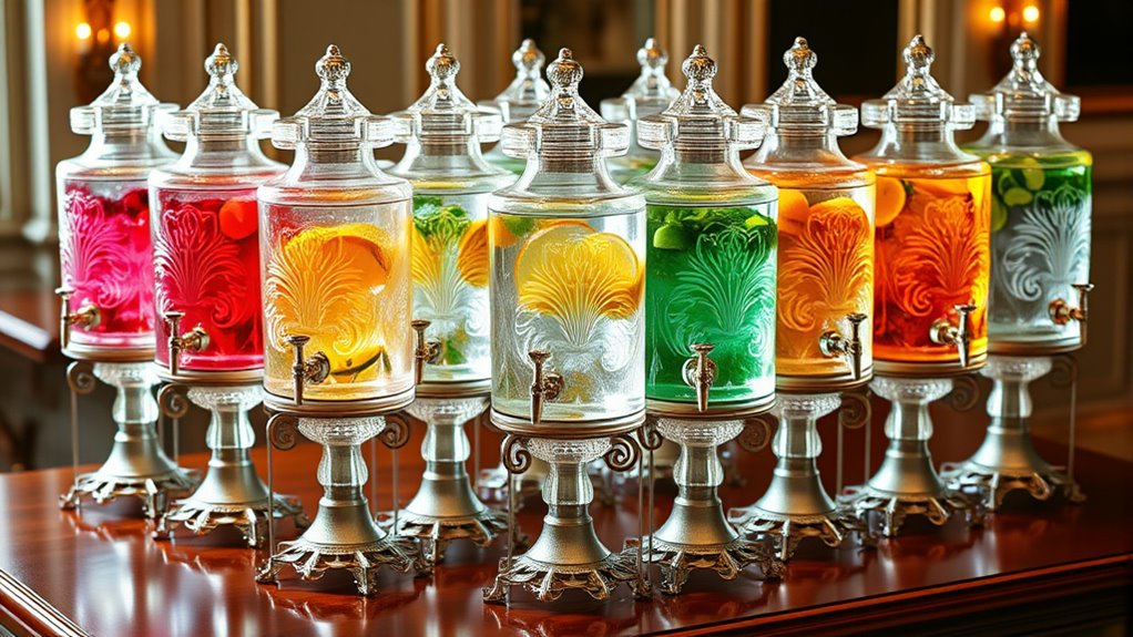 If you’re looking for the 15 best glass beverage dispenser sets with stands for stylish serving in 2025, I’ve found plenty of options that combine elegance, durability, and versatility. These sets range from 1 to 2 gallons, often include accessories like fruit infusers and chalkboard signs, and feature sturdy stands made of wood or metal. Whether hosting a small gathering or a large party, these stylish choices will elevate your beverage presentation—keep going to discover the top picks that suit your needs.