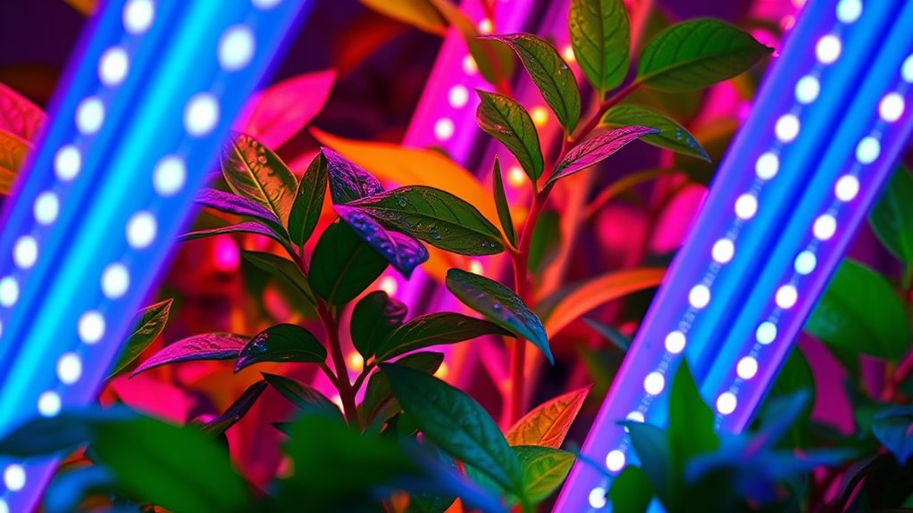 How can you guarantee your plants thrive under artificial light? The key lies in choosing full spectrum grow light strips that cover a wide range of wavelengths, typically from 380 nm to 800 nm. This range includes ultraviolet, visible, and near-infrared light, essential for exhaustive plant development. I focus on lights that incorporate red light (610-720 nm) for flowering and blue light (410-520 nm) for vegetative growth. Some grow lights even add yellow, green, and far-red wavelengths to mimic natural sunlight more accurately. By selecting a light with a balanced spectrum, I ensure my plants receive the necessary wavelengths for all growth stages, from seedling to flowering, without gaps that could hinder their health and photosynthesis efficiency.
