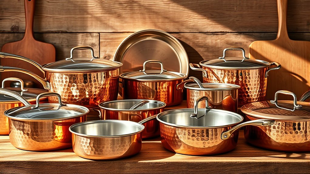 Imagine the warm glow of copper catching the light as I cook—hammered copper sets excel in heat conductivity, warming quickly and evenly across the surface. They outperform stainless steel and cast iron, responding instantly to temperature changes. I find this rapid heat transfer helps me cook with precision, avoiding hotspots. So, if you want cookware that heats up fast and distributes heat beautifully, hammered copper is a top choice.