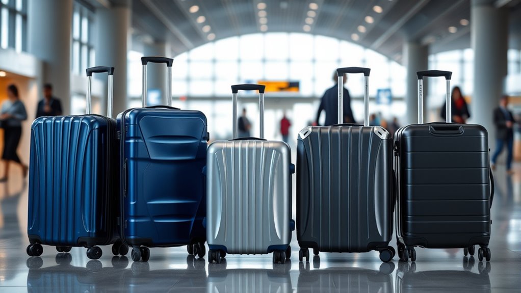 Choosing a durable hard-sided luggage set hinges on the materials used in its construction, as these directly impact its ability to withstand the rigors of family travel. Impact-resistant materials like ABS, polycarbonate, or PC+ABS composites provide strong protection while keeping weight low. Quality zippers, especially TSA-approved ones tested for thousands of cycles, are vital for longevity and resistance to splitting or breaking. Reinforced corners, protective feet, and impact-absorbing features help prevent damage from drops and bumps, common in airports. Surface finishes like scratch-resistant coatings or matte textures maintain the luggage’s appearance over time. Additionally, high-quality, lightweight materials ensure the set remains easy to maneuver while offering robust protection against impacts and environmental factors. Durability truly depends on these construction choices.