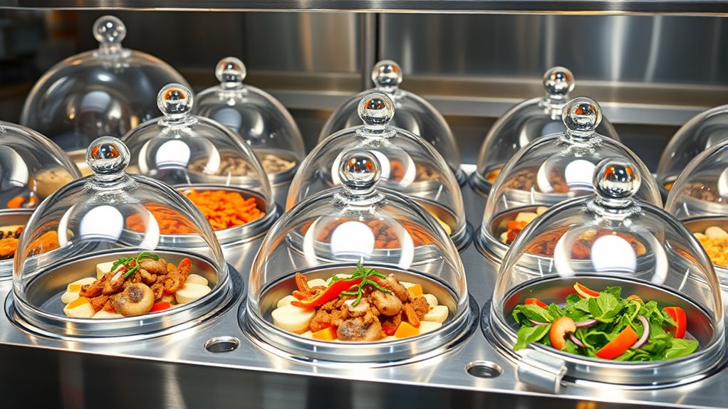 Heated fog-free dome covers prevent condensation by maintaining a consistent, gentle warmth that stops moisture from forming on the glass. I make certain the heat is just enough to evaporate any fog, without drying out the food. This controlled temperature keeps the surface dry and clear, allowing your customers to see the food inside easily. I find that these covers are a simple, effective way to enhance presentation and keep everything looking fresh.