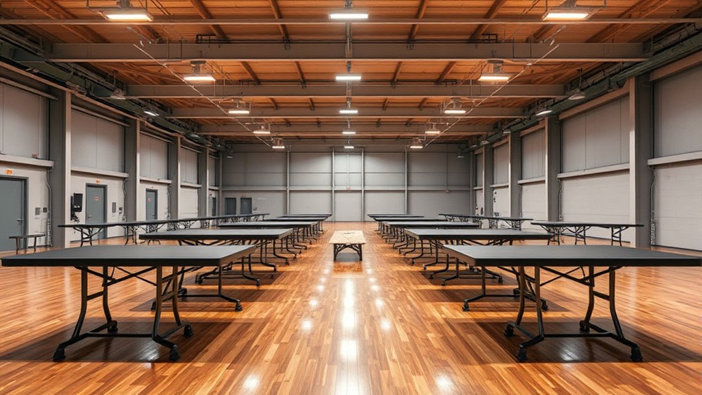 Most heavy-duty banquet folding tables support between 1,000 and 2,000 pounds, depending on the model and construction. I’ve found that these tables are built to handle substantial loads, making them perfect for large events or heavy equipment. When choosing a table, I always check the manufacturer’s weight capacity to make certain it meets my needs. Rest assured, these tables are designed for durability and to support significant weight safely.